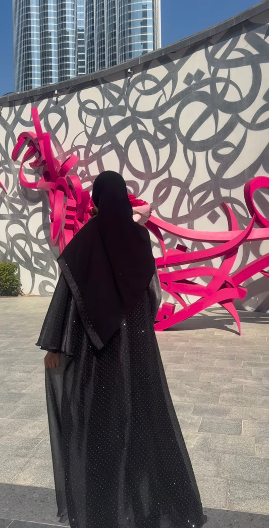 UAE-based fashion Influencer Farha glows in our Best Selling Rainstone Abaya — a piece of elegent she is wearing beautifully, and Styled it with elegance and quiet confidence.