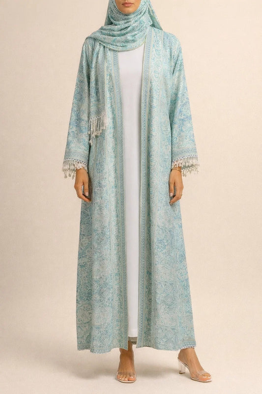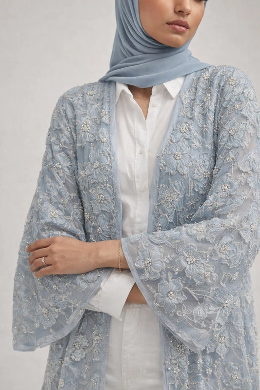 Vibing in Blue BRAIDED ABAYA. ❄️ She wore it, and it came alive — grace in every movement 👜🪞